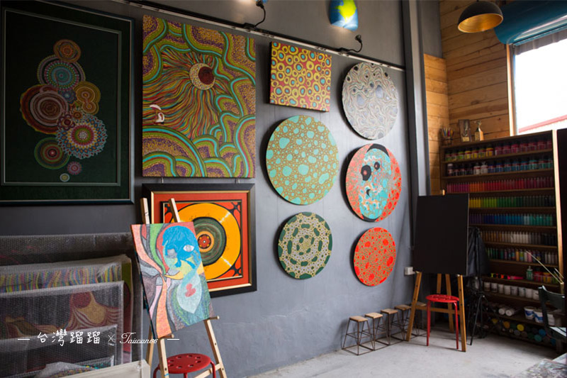 走道工作室後方,是整個牆面的畫作,繽紛的配色與圓點、幾何圖形的搭配,看起來除了魔幻,也讓人想起小時候生物課本裡顯微鏡下的切片成像。