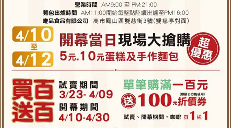 你知道東西去哪裡買最划算嗎?當然是直接殺去工廠款貨啊!!你有看過觀光工廠邊觀光邊購物,但你有看過烘焙工廠直接賣麵包嗎? 鳳山著名的媽祖廟雙慈亭旁邊最近開了一間超狂的烘焙工廠,除了場地大、種類多、價格優惠外,最近開幕期間還有買百就送百的超狂優惠! 會說狂是因為優惠沒有上限!買百送百買千送千,名副其實的買多賺多!這麼優惠的新消息到底真實情形如何,快跟我們秒跟上先來逛逛唯品麵包吧!同時為注重效率的你,準備以下你該看下去的三大重點。