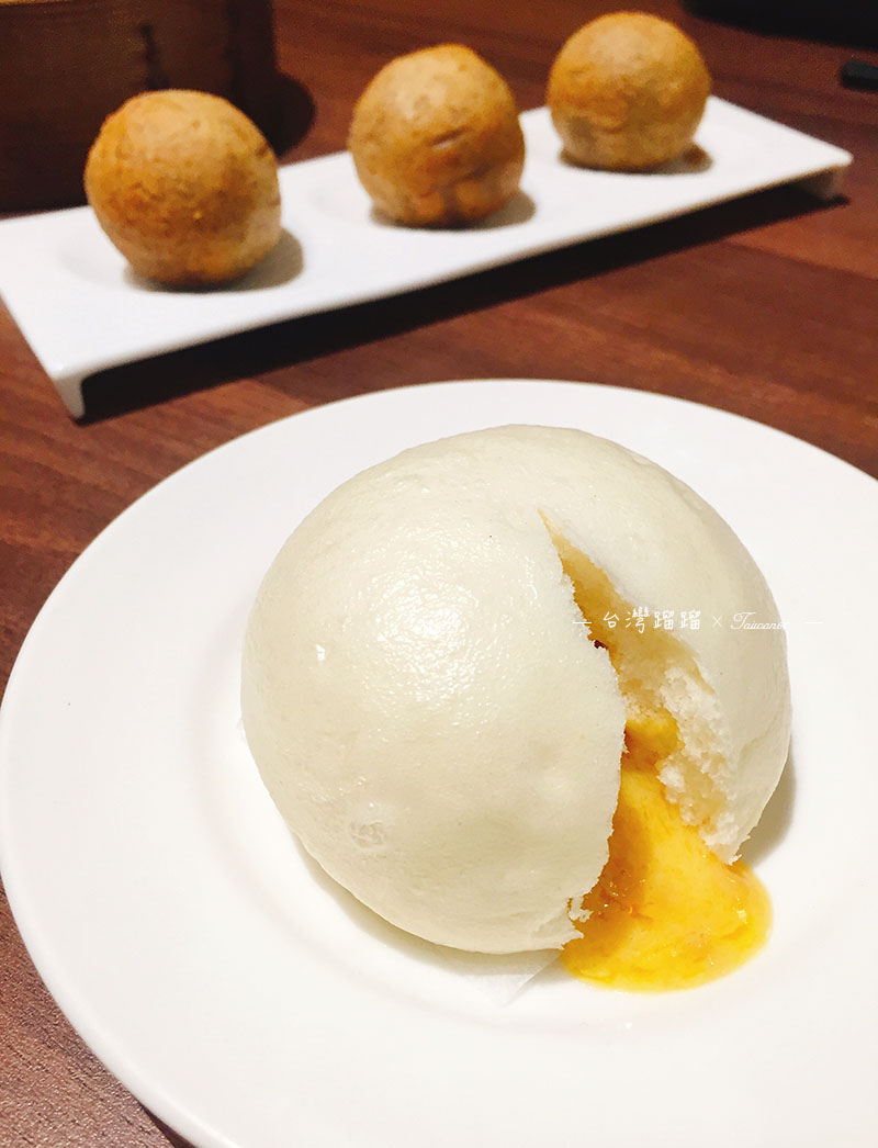 最厲害的是圖中後面的「流沙芋頭丸」,很可惜我拍到它流沙出來的樣子,是芋頭控會很愛的一道甜食。愛芋頭的絕對要點!!芋頭用料紮實,鹹甜香的流沙內餡也填得超飽滿,一次吃三顆絕對不是問題的!