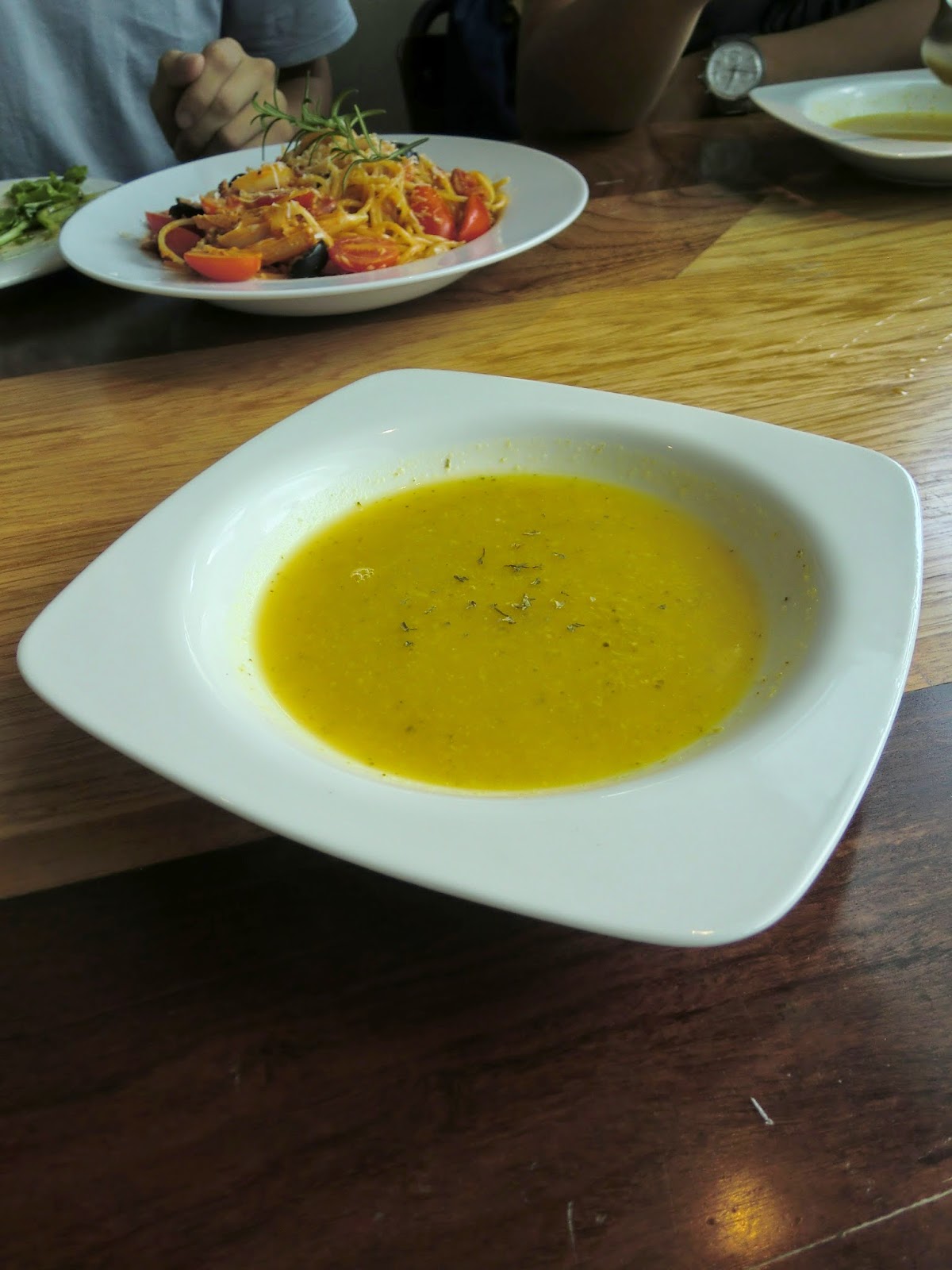 | 當天點用簡餐的附湯 - 南瓜蔬菜湯,吃的到一絲一絲的南瓜纖維