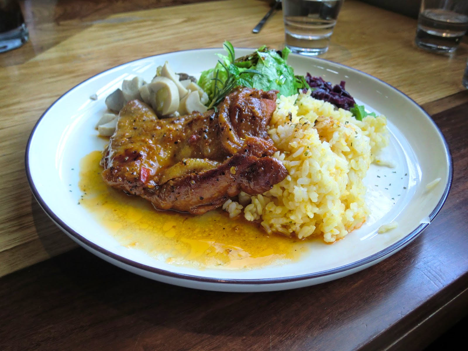 只可惜肉質烤的略柴了些,沒有汨汨流竄的湯汁,憑添缺憾的美感一旁金黃色澤的南瓜飯,以健康為取向,帶著淡雅的南瓜清香