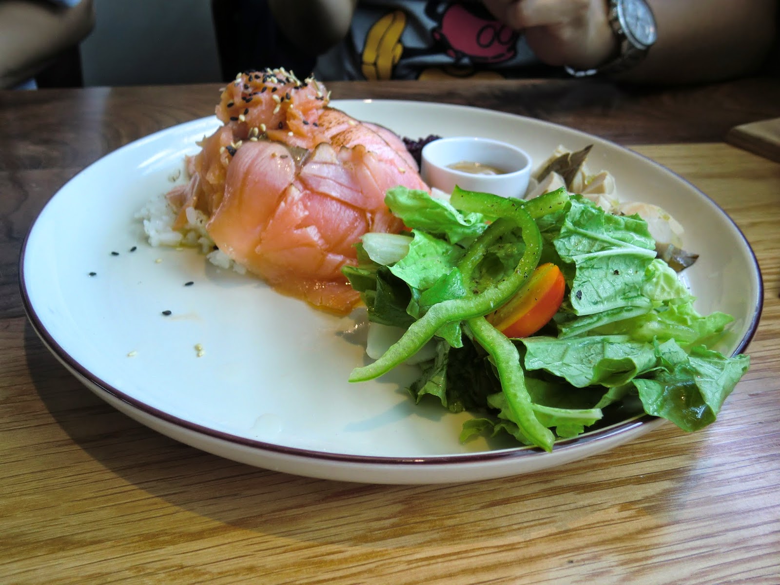 主菜上為切成薄片狀的煙燻鮭魚,有經過烤炙手續 (用火焰槍 ? ),所以仍呈現半生微熟的狀態