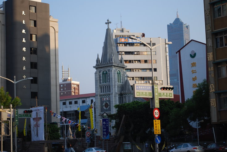 - 玫瑰聖母堂是臺灣最大主教座,創建於1859年,是天主教會在臺灣重新開教建立的第一座教堂。也是近代臺灣天主教會發源地,現在成為天主教高雄教區主教座堂,也是亞洲三大聖堂之一。主教堂的整體建築造型仿歐洲歌德式教堂風格,並混合部分羅馬風格;內部的聖壇以八角環形的方式呈現,在2001年臺灣歷史建築百景票選中獲得全國第一的名次